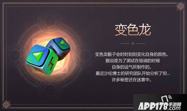 变色龙骰子:变色龙骰子会时时刻刻变化自身的颜色。据说是为了测试在极端的时候,自身的运气所制作的。最近沙伦博士的研究团队开始分析了但......许多秘密还在迷雾中。