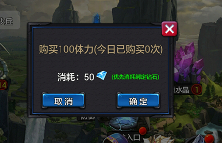 1、钻石购买:主界面中点击体力框上的+号,弹出框确定即可花费钻石购买体力。每天最高可购买10哦。