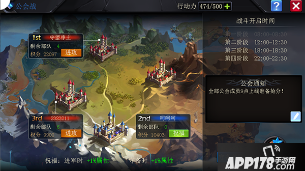 进攻:消耗行动力直接攻击敌对公会(击败守备部队后还可额外掠夺其公会1%总积分至自身公会)