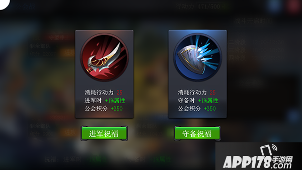 祝福:消耗行动力对其它公会成员出战祝福或守备祝福,被祝福的公会出战成员,下次进攻或守备可获得属性加成。