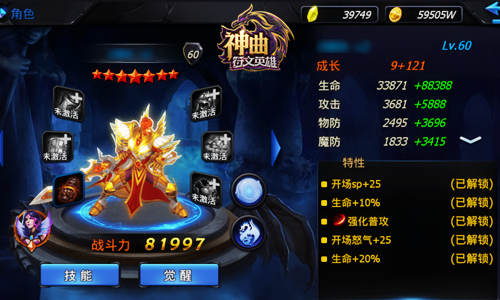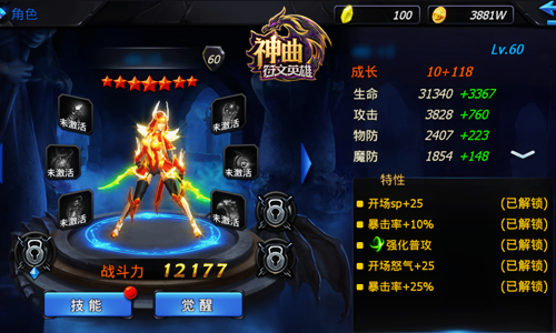 特性:开场SP+25、生命+10%、强化普攻、开场怒气+25、生命+20%。