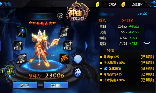 特性:开场SP+25、法术伤害+10%、强化普攻、开场怒气+25、暴击率+20%。