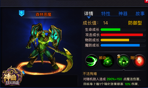 森林恶魔在《神曲之符文英雄》中的定位是防御型魔灵,拥有十分强大的魔防和攻击成长潜力,在对阵以魔法为主的敌人是,森林恶魔一出场就已经能让你立于不败之地。由于是橙级的顶级魔灵,在神器突破和神器大师上都有极强的解锁属性,全面提升生命值、暴击,附加额外的护盾技能。