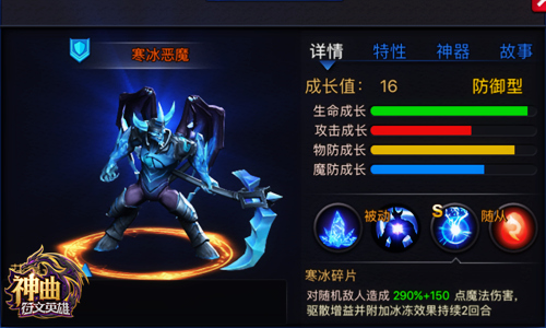 从地狱极寒之地归来的寒冰恶魔,在《神曲之符文英雄》中是橙级防御型魔灵,拥有成长潜力极高的生命和物防属性,如果说森林恶魔是法防坦克,那寒冰恶魔则是物防坦克。在搭配寒冰恶魔自身强大的被动技能和寒冰属性连锁攻击,在魔灵对战时,边打可以边自我治愈,抗打击能力极强!