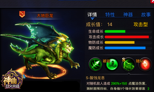 “翠绿鳞甲”和“酸蚀龙息”如果配合的好,可以打出极为恐怖的溅射伤害,让大地巨龙拥有强大的AOE能力。《神曲之符文英雄》五色巨龙在女神沉睡后已经守卫这个宇宙千年,如果特鲁尼斯符文之战一触即发,你的巨龙军团,准备好了吗?