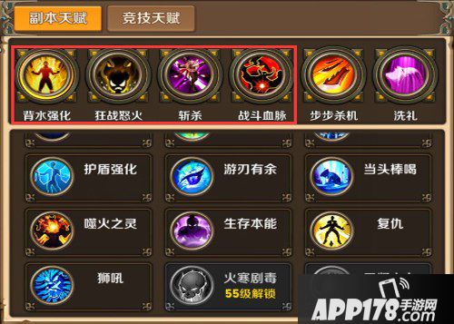 讲解:战斗时,通过背水强化、战斗血脉维持血量在20%左右,通过斩杀、狂战怒火带来的超强百分比攻击力加成作为输出手段。其实通过背水强化和战斗血脉对血量的维系并不足,还需要卡片和装备的支撑。