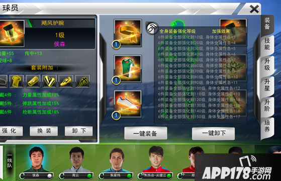 本游戏中,每名球员可以穿戴最多6件装备,分别为头套、护腕、上衣、护腿板、球鞋和纹身。每件装备都可以强化,但是装备的最高等级不能高于球员的等级。