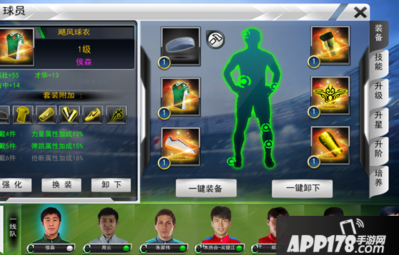 本游戏中,每名球员可以穿戴最多6件装备,分别为头套、护腕、上衣、护腿板、球鞋和纹身。每件装备都可以强化,但是装备的最高等级不能高于球员的等级。