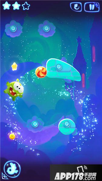 当糖果获得第一颗星星的时候将绳子割断,糖果便可顺着星河达到指定位置。