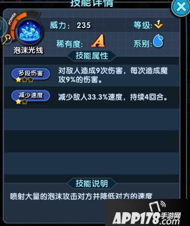 奥义技能:泡沫光线---对敌人造成9次伤害,每次造成魔攻9%的伤害并减少敌人的速度,持续4回合。