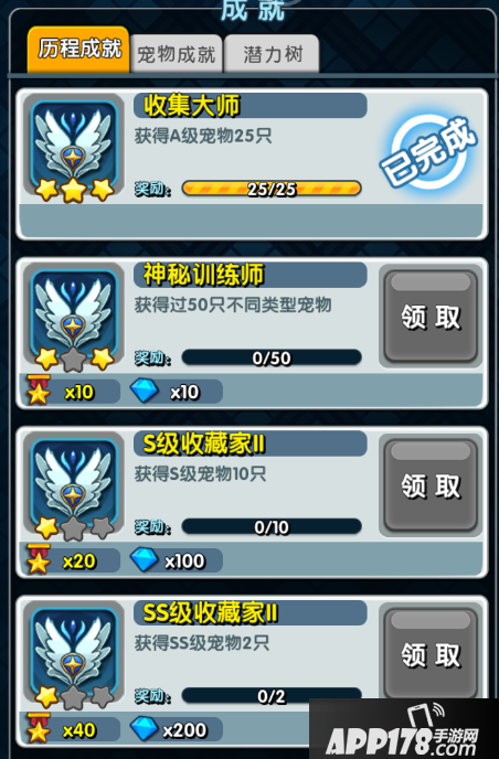 成就分为历程成就、宠物成就两种,历程成就以在游戏中的行为内容为主,宠物成就则是以收集的宠物信息为主,满足不同训练师进行挑战。