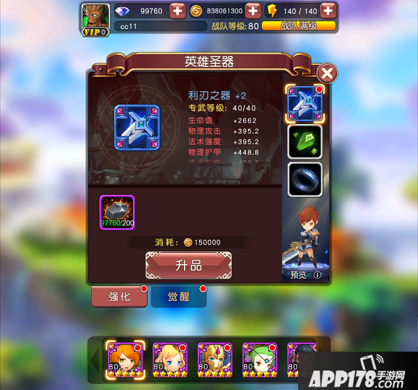 每个圣器可以升级,当升级到当前圣器的等级上限后,可以升品,增加属性和提升下一阶段的等级上限。升品需要消耗对应材料,材料可以在公会副本内获得。