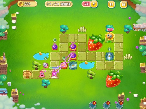 过关策略:首先在中间区域建造两根防御塔并进行升级,前面几波小怪可以很轻易地被清理。但重点还是在于如何清除这四颗大草莓,首先左上方的草莓可利用前期清怪的空闲时间进行清除。并在清除后,在该区域建造防御塔,尽量在前面的防守区域将怪物消灭。另外,可在靠近终点区域处建造防御塔以防止怪物逃脱。