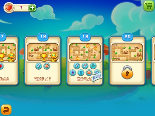 上一关的配置有点寒酸,但这一关的配置瞬间就变成了嘉年华。风车塔、火焰贝壳塔以及射线等7种防御塔皆上线,如此大的阵容就算有20波攻势也不在话下,更何况还有1050的初始金币,足以在前期建造多个防御塔。