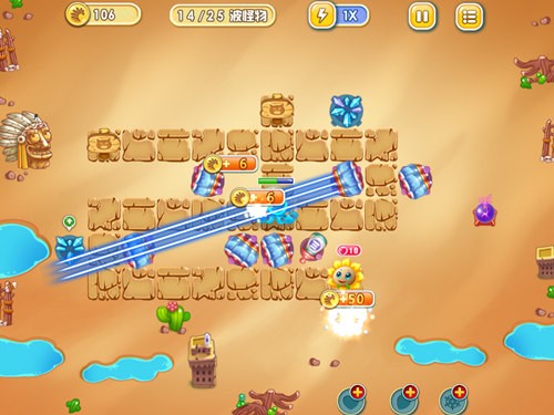 一开始可以先在左右两颗仙人掌处附近建造两根激光射线塔,并可以直接升至顶级。接下来就存够金币建造第三个激光射线塔,该位置可在靠近终点的仙人掌处,也是一处中心交汇地带。左侧的怪物出现的时候,右侧的防御塔可以集中火力来清除障碍物。