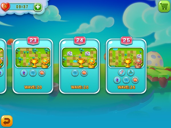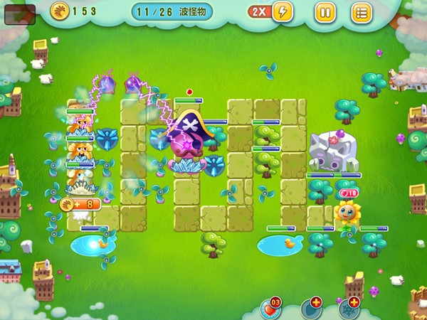 这一关的防御塔有单体和群体减速塔,单体威力较大的闪电塔,以及具有范围穿透攻击的风车塔和火焰贝壳塔这5种防御塔,且闪电塔、风车塔和减速塔是通关必备的。闪电塔的单体伤害是击杀BOSS的主要输出点。减速塔可以从一开始就减慢BOSS的移动速度,风车塔则是可以作为清除小兵和周边障碍的关键,可以增加不少额外的收入。