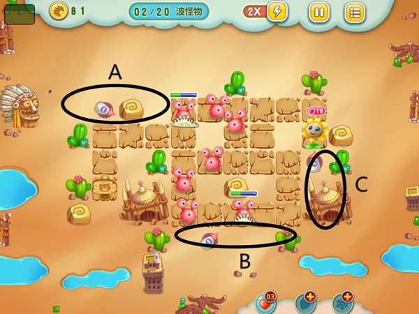 万能胶塔至少要建造两根以上,一处为开局的A区域,一处为B或C区域,有资金的玩家可两处都建造。这关能否达到无伤效果就靠这几根减速塔了,所以布局位置很关键。