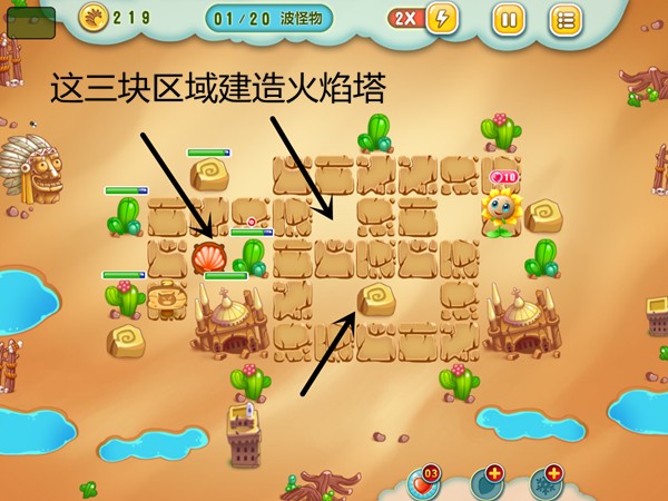 由于该关卡有多处十字路口,所以火焰贝壳塔的周边范围伤害特点就可以很好地发挥作用。地图中标出的3块区域都可以建造该种防御塔,可以将火焰贝壳塔的威力发挥到极致。
