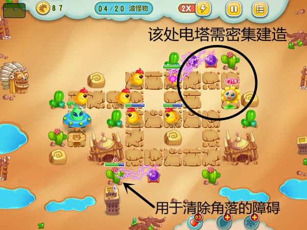 在蒙牛真果粒《花儿与少年》官方手游第二个主题——沙漠中,第一个关卡共有20波怪物攻势。本关卡提供三种防御塔:火焰贝壳塔、闪电塔以及万能胶减速塔,其中火焰贝克塔是关键。作为第二主题的首个关卡要通关比较容易,周边的障碍也较容易清除。但本关小怪的移动速度较快,要无伤过关有些难度。小编今天就来介绍下,要如何完美通关。