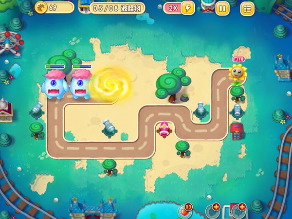 不过本关的难点反而在于障碍物的清除,虽然关卡中单个障碍物并不难清除,只需一根圆珠塔即可,但由于分布过于分散所以需要到每个区域中都建造防御塔来清除障碍。只有8波的攻势也就意味着在清怪的同时也要把握好每一波有限的清障碍时间。建议本关不要使用2倍速,保持原速才能更稳定的清除障碍。