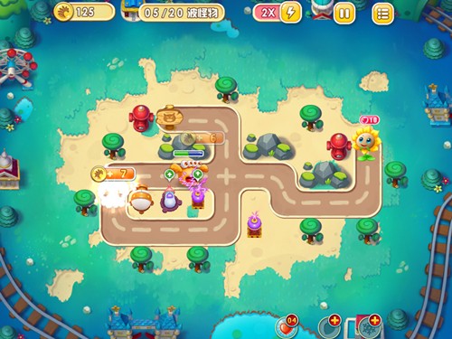 过关策略:一开始可以建造两根闪电塔,并争取在第一波过后将明星防御塔周边的石头清除,即可摆放一根减速塔以及闪电塔。之后只需升级这两根防御塔即可,其他时间就可以安心地清除后面的障碍物。