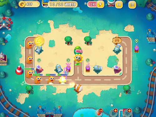 过关策略:本关关键的防御塔在于圆珠塔,虽然靠近终点处的两个障碍物会掉落闪电球塔,但由于太过靠近终点,使其并不能发挥很好的火力打击效果。建议在升级防御塔上还是以圆珠塔为主,配合万能胶水减速的效果,足够清除两边的小怪。消除障碍物的时间点可利用怪物左右两边进攻的时间差,左边打怪右边立刻消除障碍物,在怪物靠近终点时再集中所有火力进行打击。建议本关使用一至两枚草莓炸弹。
