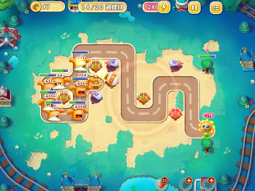 过关策略:此关由于火焰贝壳塔的强力打击效果,无论是消除障碍物或消灭怪物都较为轻松,通过在各转弯路口处放置火焰贝壳塔即可。配合万能胶水的减速,完全可以将怪物们消灭在前面的区域,而后面的障碍物也只需放置两根贝壳塔来清除,等障碍物都被清除即可拆除,将所有的火力集中于前面的区域。