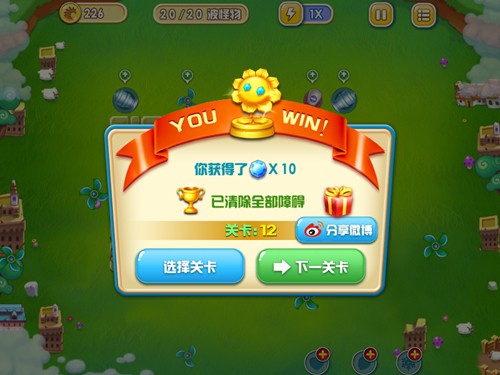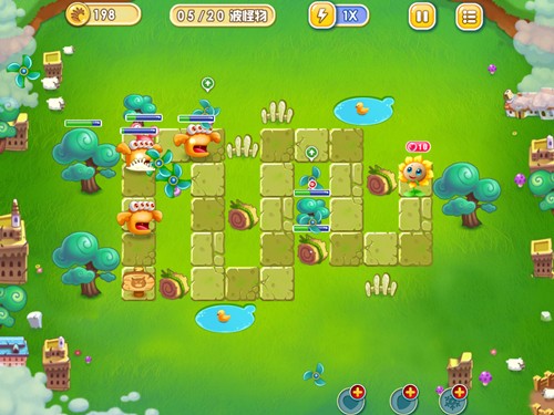 基本配置分析:本关虽然只有圆珠塔和大风车塔,但其实只需风车塔就足以。20波的攻势虽多,但只要风车成型多少波攻势都完全不在话下。另外,450金币虽不多,但也可以将风车塔升至顶级。