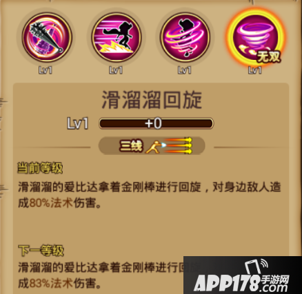 使用心得:使用该技能时,爱比达会拿着金刚棒旋转着形成一个竖立锥形旋转攻击圈,对身边敌人造成伤害。