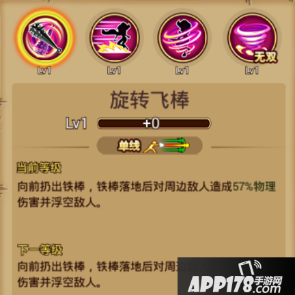 基本介绍:单线范围,向前扔出铁棒,铁棒落地后对周围敌人造成部分物理伤害并浮空敌人。