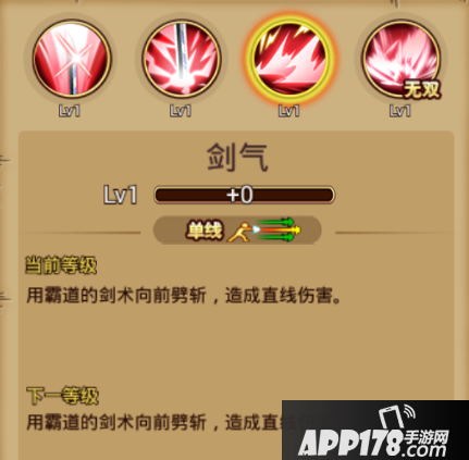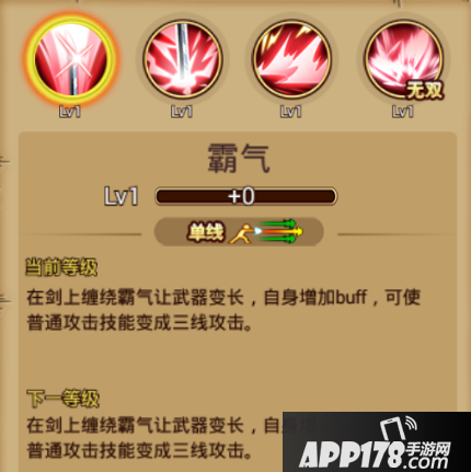 技能介绍:单线范围,在剑伤缠绕霸气让武器变长,自身增加buff,可使普通攻击变成三线攻击。