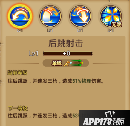 技能介绍:单线攻击,往后跳跃,并连发三枪,造成部分物理伤害。