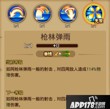 技能介绍:单线攻击,如同枪林弹雨一般的射击,对四周敌人造成物理伤害。