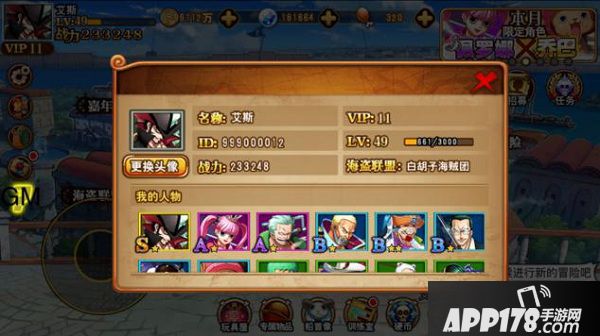 在游戏内主界面左上角的人物头像就是你游戏中的个人形象,它默认显示路飞的初始形象,以及你的角色名、战力和VIP等级。点击人物头像进入玩家信息界,可以看到主站队长的战力,已收集到的人物角色,海盗联盟等个人信息。同时,点击更换头像,可将头像更换成你已获得的人物头像。这里展现了个人游戏中的成果,要加油喔,要努力成为海贼王的男人! !