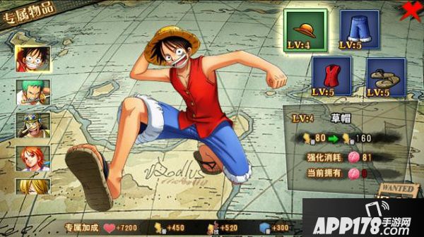 点击打开游戏主界面的专属物品。专属物品目前只有路飞、佐罗和撒谎布等9个专属角色拥有,团队等级越高,开放的专属人物越多,可强化的专属物品也越多。每个专属角色有4个专属物品,通过强化对应的专属物品,可以获得对应的属性加成,带来战力上的提升。在专属物品中,我们可以看到,路飞的草帽、佐罗的和道一文字,鹰眼的黑刀等等,将带给你原汁原味的海贼王气息。