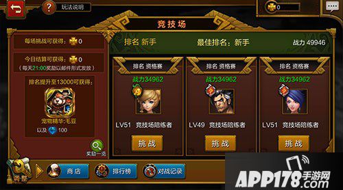 进入竞技场,选择战力值相差不大的敌友进行挑战,敌友战力值显示为绿色,则说明战斗胜利的可能性较大。战力值为黄色则说明实力相当,战斗胜利可能性对半。而战力值为红色,则说明敌方战力比较高,战斗胜利可能性很小,不推荐机型挑战,当然操作、装备、技能搭配较完美的玩家可以忽略。