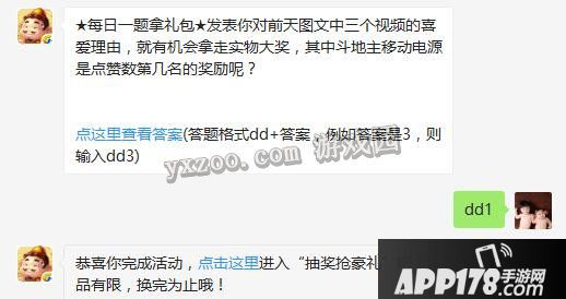★每日一题拿礼包★发表你对前天图文中三个视频的喜爱理由,就有机会拿走实物大奖,其中斗地主移动电源是点赞数第几名的奖励呢? 小编现在就来公布正确答案喜欢QQ斗地主的朋友不要错过哦!