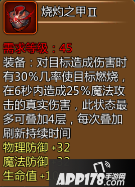PS:说实话游戏中带生命值的胸甲不是很多,一旦发现有,就值得给坦克英雄入手一件,当然如果你坦克够硬,你可以把这件装备给队里法系职业来触发装备特效,请注意这里的特效是没有冷却时间的,只跟英雄的伤害频率有关,那么痛苦术和火法等DOT职业可以更好的利用这件装备,毕竟25%的伤害叠四层的话就是100%伤害!