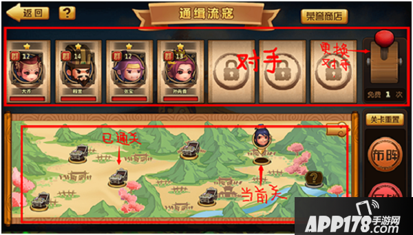 进入之后我们可以看到,上面显示出对手阵容。下方地图能够显示出目前所有的关卡,以及当前所在位置。