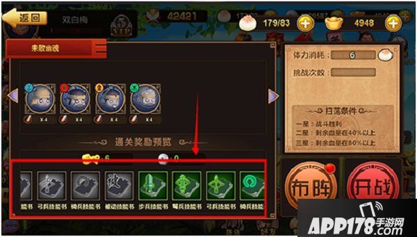 挑战成功可获得道具【技能书】。难度越高,可获得的武将经验类道具品质越高。如下图: