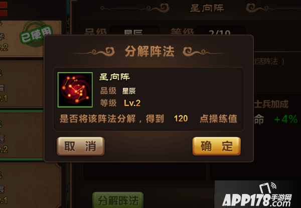 在游戏中你会获得一些相同的阵法,多出的阵法可以进行分解处理,分解阵法可以获得操练值。