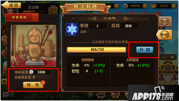 阵法等级需要通过操练值进行升级,操练值可使用银币和元宝进行吸收,吸收到满值后阵法会进行升级,升级后对应的加成属性也会获得提高。