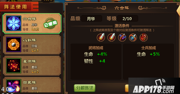 阵法系统在游戏中有着至关重要的作用,不同的阵法需要不同的武将配置来激活。激活阵法后会获得武将与士兵的相关属性加成,让你的阵容更加的强大。