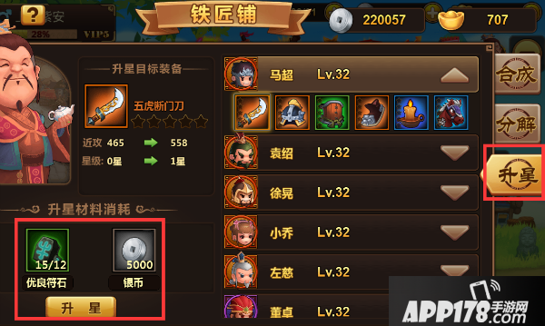 在分解装备后会获得符石,符石主要用于装备升星。在铁匠铺中可以给武将穿戴的装备进行升星,升星需要消耗符石和银币。