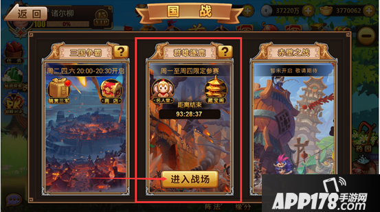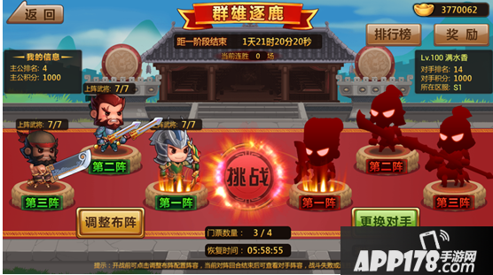 群雄逐鹿在主公到达35级时候开启,每周六22:00竞技场排位前100名可以夺得进入资格。
