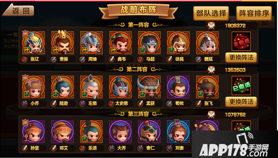 获得资格后进入战前布阵,我们可以从下图得知,群雄逐鹿战前布阵有3套阵容,每一套阵容上场7名武将,总可上场21名武将;合理分配武将上场顺序和组合是赢得比赛的前提。