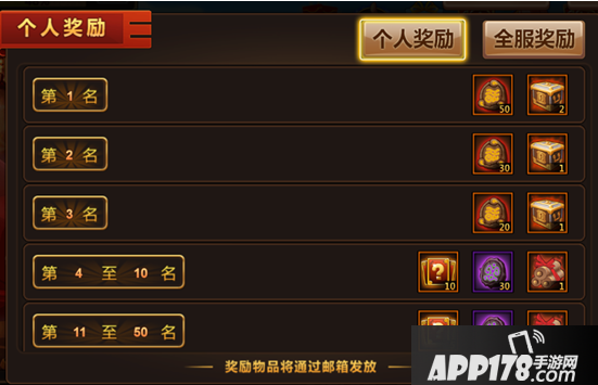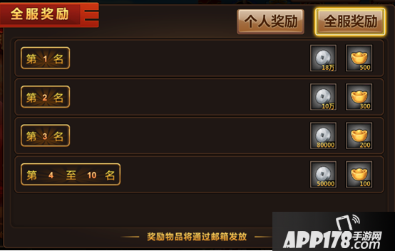 巅峰对决结束后,排行前10的玩家所在的服务器的所有玩家可获得奖励。其他参赛玩家即可获得个人奖励。奖励在当然22:30前通过邮箱发放。