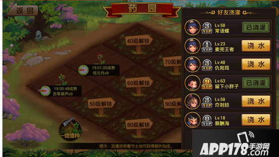 药园种植20级开启后,总共有9块田地,每隔10级解开一块田地,到达100级即可全部解锁使用。
