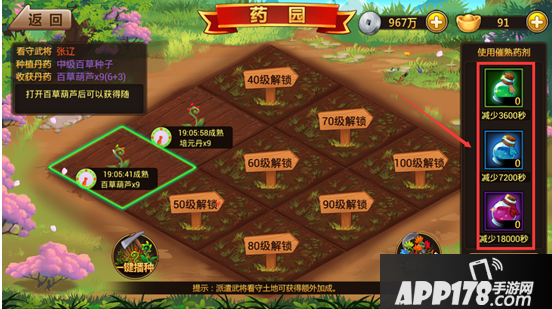 【药园】是《洪荒之力》播种丹药种子的系统,在主公达到20级时开启。种子分为高、中低三个级别。分别有培元丹种子、怒神丹种子、玄元丹种子、金乌丹种子、百转丹种子、百魂丹种子。