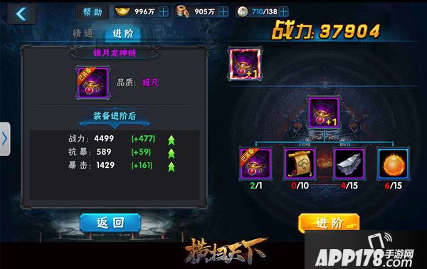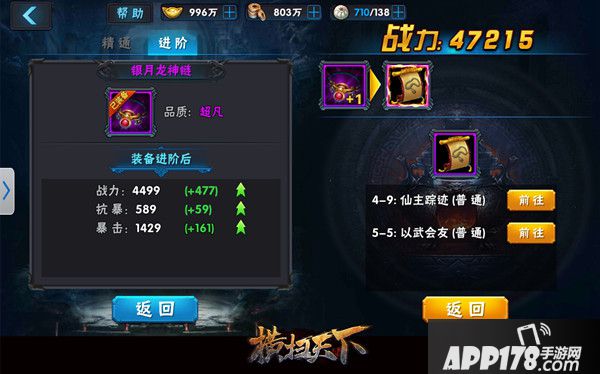 先前说过,装备按颜色的话是紫的、橙色、红色。上图精通等阶也和装备品质一致。提升对应装备部位的精通,起对应属性会增长。提升装备精通消耗铜钱。所以游戏中的铜钱非常有用。